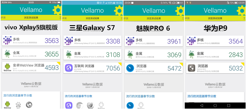 瀏覽器三星Galaxy S7>魅族PRO 6>華為P9>vivo Xplay5旗艦版