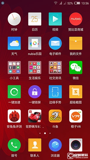 軟件方面,“小屏手機(jī)”——nubia Z11 mini搭載基于Android 5.1.1深度定制的nubia UI 3.9.6。對于nubia UI,“牛仔”必然十分熟悉。nubia UI 3.9.6則是最新的nubia UI版本。相比前作,它采用全新的界面設(shè)計(jì),加入了全新主題,對桌面圖標(biāo)進(jìn)行了重繪,樣式依然以圓角矩形和圓形為主,如圖所示。