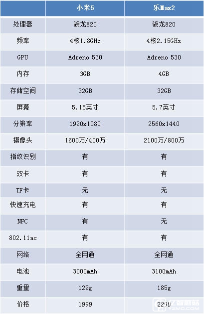 先讓我們看看兩者的配置,由于小米只有標(biāo)準版有貨,而樂Max2套餐價是2299,2099的沒貨,所以我們都如實標(biāo)注。