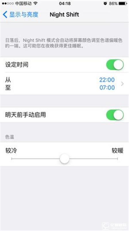 Night Shift的夜景模式在設置菜單的“顯示與亮度”列表中開啟,我們手動設置該模式自動開啟的時間段,以及調節在該模式下屏幕顯示的色溫。