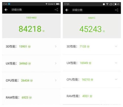 左圖為360手機(jī)N4跑分成績(jī),右圖為魅藍(lán)Note3跑分成績(jī)
