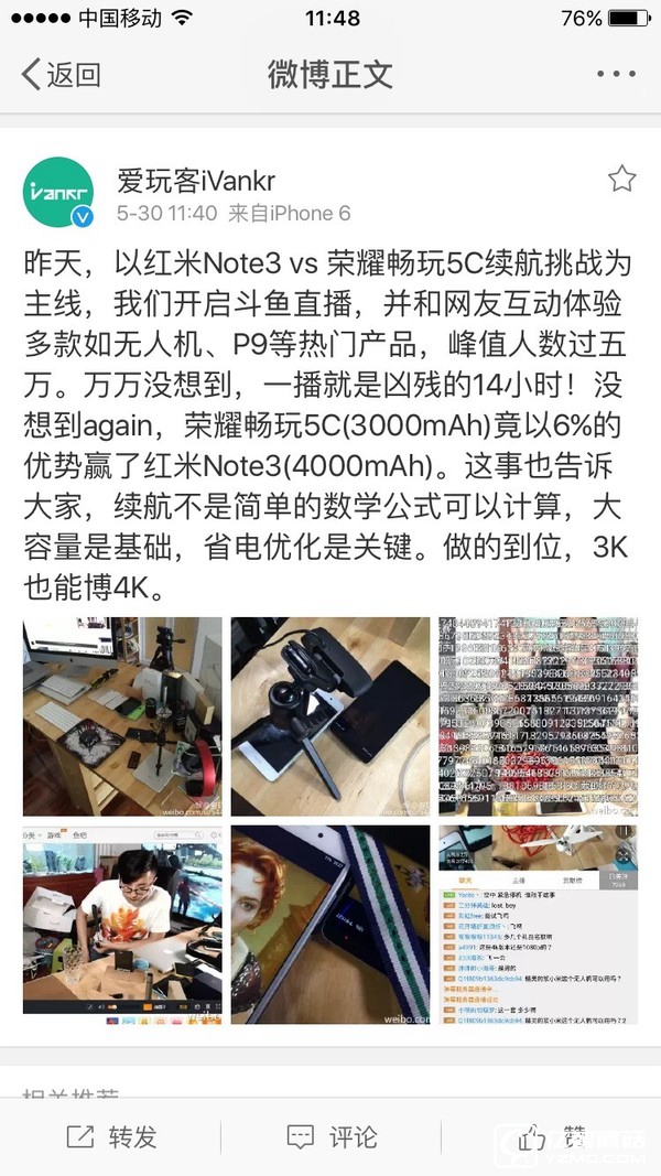 走霉運的雷布斯并沒有因為飛機掉了,剎住倒霉的發展,相反還有更多人跑來墳頭蹦迪。昨天,科技自媒體愛玩客在數幾萬人的圍觀下,對榮耀暢玩5C和紅米note 3的續航能力進行直播。