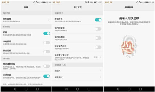 兩款手機均支持指紋識別,首先我們先來看看華為P9:從指紋功能設置頁中能看到,在相機取景模式下,長按指紋感應器可進行快門拍攝(約0.5秒);在來電時可長按傳感器進行接聽;在鬧鈴響時可長按傳感器停止鬧鐘。