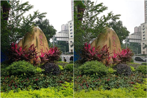 從以上兩組樣張中我們不難看到,無論是是在畫面色彩和細節保留方面都有著不錯的表現。細節上,vivo Xplay5的出片色彩對比度相對要更濃郁和高亮,但邊角部分會有略輕微的曝光過度情況。華為P9則得益于雙攝像頭對細節的捕捉,對樹葉的邊緣勾勒有較好的保留,但出片色彩和亮度則相對要保守一些。