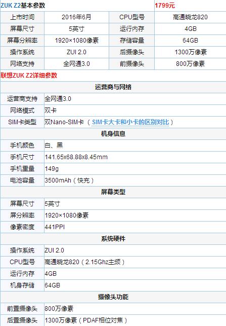 通過下面顯示的詳細參數(shù),我們可以對ZUK Z2各個細節(jié)方面有全面了解,喜歡這款機型的朋友,不妨初步了解一下。