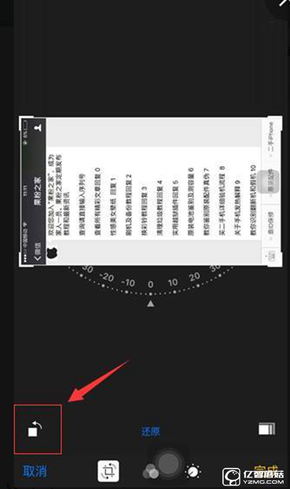 3、進入裁切模式后,再點擊左下角的“90度旋轉”圖標,最后點完成。