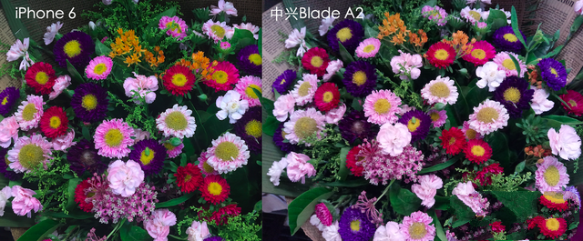 整體視覺上兩者的畫面都很細膩,這和中興BladeA2所搭載的1300萬像素攝像頭有關,iPhone6色彩還原度更高,中興BladeA2則通過提升亮度保證暗部細節的清晰,但也一定程度上讓白天樣張略顯偏白。