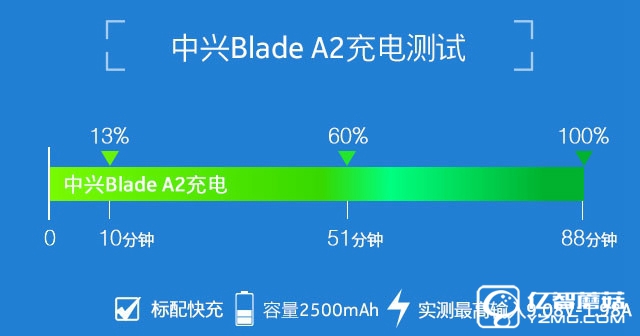 從上圖的充電測試可以看到,中興BladeA2可以做到10分鐘充13%,而充至用戶安全心理線的60%也僅需51分鐘,事實上在一個半小時內你就可以把自己的中興BladeA2充滿電。