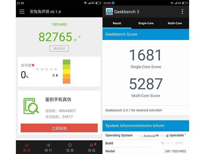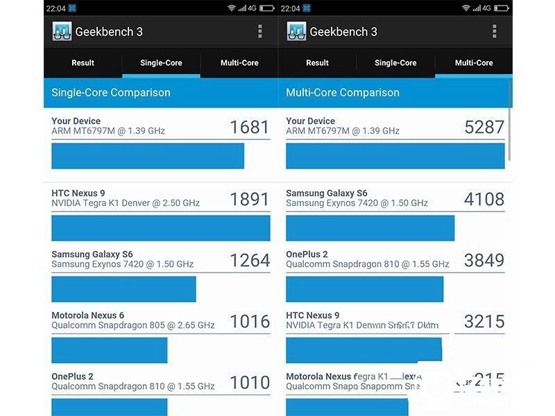 從安兔兔跑分來看,82765基本符合預(yù)期,Helio X20配合4GB內(nèi)存已經(jīng)超越了上代頂級安卓旗艦。Geekbench3跑分結(jié)果也極為類似,單雙核跑分均大幅領(lǐng)先三星Galaxy S6,應(yīng)該可以稱得上性能強悍。