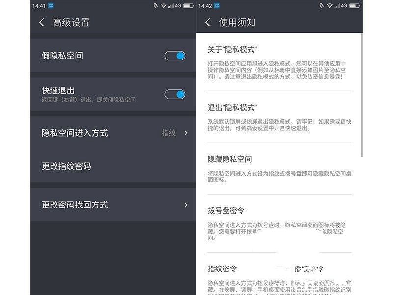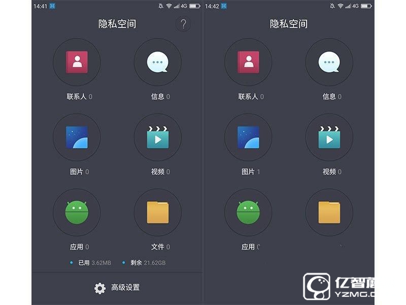 其次是隱私空間,用戶可以把私密的信息保存到該空間中然后設(shè)置加密方式:指紋、數(shù)字和圖案。這個隱私保護空間異常強大,和市面上常見的文件加密大大不同。