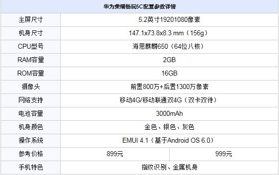 其它配置方面,榮耀5A采用2GB RAM+16GB ROM,支持最大128GB額外存儲,5英寸720P分辨率屏幕,1300萬像素主攝像頭,800萬像素前置攝像頭,系統版本為安卓6.0,電池偏小,僅有2200mAh。