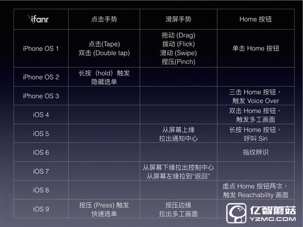 下圖是歷年iOS所新增的全新的觸控交互方式(不包括iPad的新手勢),我們可以看到iPhone的觸控交互手段的變化:
