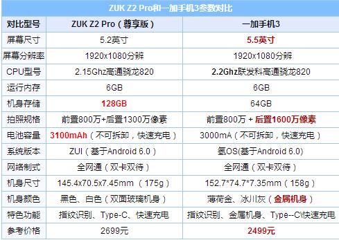 ZUK Z2 Pro和一加手機3參數對比