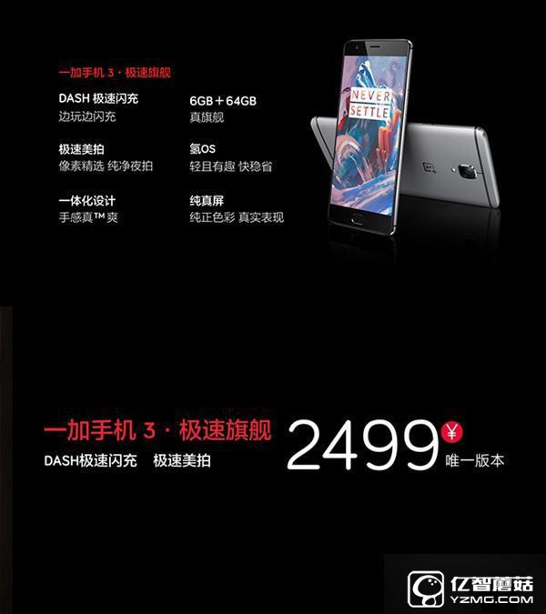 一加手機3的最終售價為2499元,有且只有一個版本,沒有所謂的低配版和高配版。