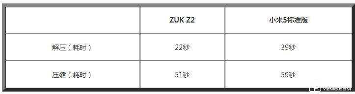 結果一目了然,ZUK Z2表現給力,尤其是在(系統自帶)解壓方面優勢巨大,這意味著無論是安裝大型apk文件還是進行系統升級等操作,Z2都要比小米5更具優勢,而在壓縮方面,利用ZArchiver得到的結果相差不大,但仍然是ZUK Z2勝出。