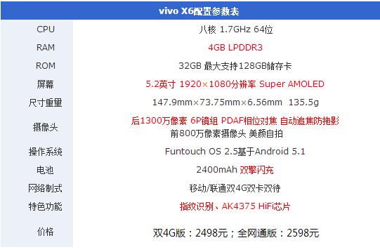 vivo X6擁有一塊5.2英寸的屏幕,分辨率為19201080,搭載一顆八核處理器,4GB RAM+32GB ROM,后置1300萬/前置800萬像素?cái)z像頭,內(nèi)置2400mAh電池,支持“雙擎閃充”、指紋識(shí)別,運(yùn)行基于Android 5.1的Funtouch OS系統(tǒng)。