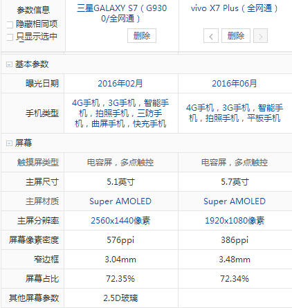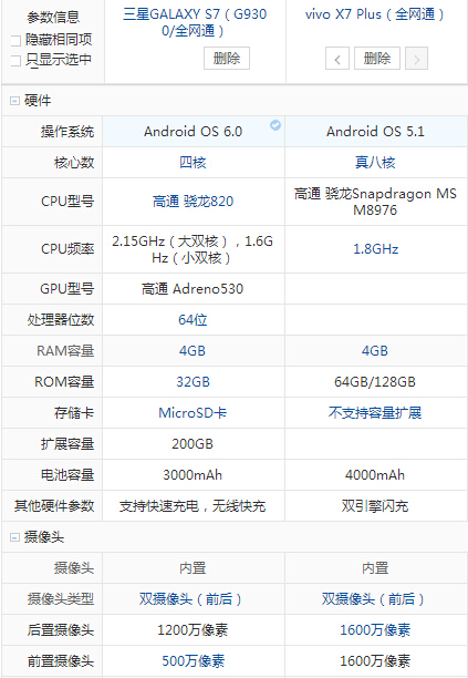 三星S7和vivo X7 Plus配置參數詳細對比: