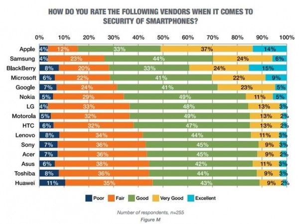 從排名來看,手機安全性排名前十五的手機品牌分別是(按前后順序):蘋果、三星、黑莓、微軟、谷歌、諾基亞、LG、摩托羅拉、htc、聯想、索尼、宏?、華碩、東芝和華為。