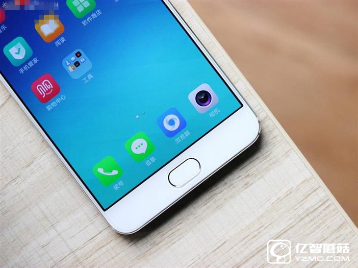 OPPO R9依舊搭載指紋識別模塊,但此次將指紋識別模塊設計在了機身正面,體驗更快更便捷,并且可以當Home鍵按壓使用;另外這顆多功能Home鍵左右兩側還有兩顆功能鍵,并且有十分貼心的背光設計。