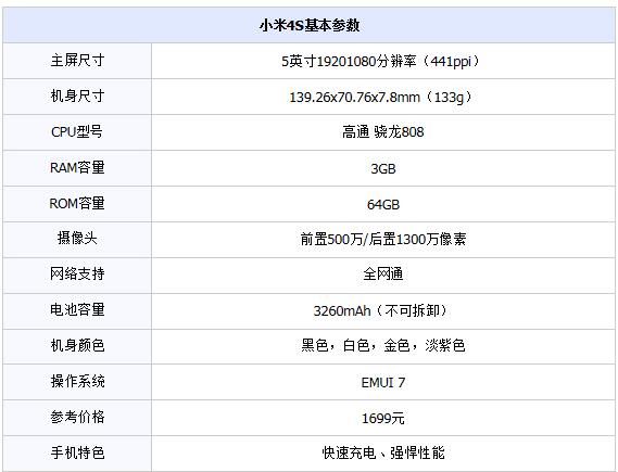 小米4S基本的硬件規(guī)格參數(shù),具體如下所示: