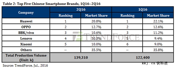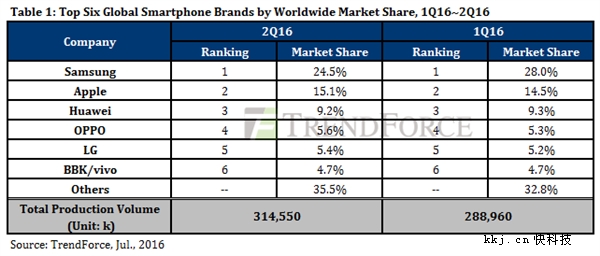 TrendFroce今天給出了2016年第二季度全球以及中國地區智能手機出貨及市占排名情況。