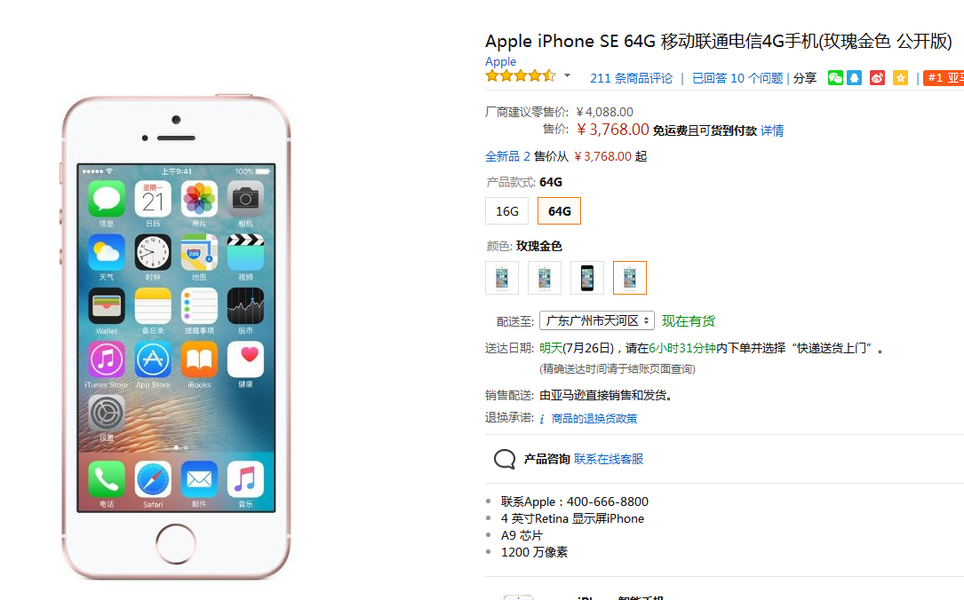 在大屏手機盛行的今天,依然有一部分用戶鐘愛小屏幕的手機,iPhone SE無疑是近期小屏手機的代表作。現在亞馬遜報價64GB版本僅售3768元,使得其性價比進一步凸顯。