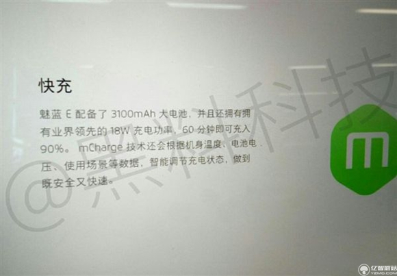 今日,有微博網(wǎng)友曝光了一張魅藍(lán)E的快充功能截圖,據(jù)了解,魅藍(lán)E配備了3100mAh大電池,并擁有18W充電功率,60分鐘即可充入90%。