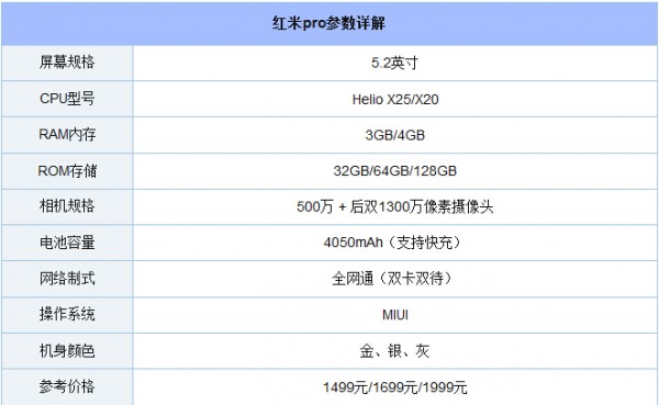 紅米pro標準版:3GB內存+32GB存儲價格是1499元,搭載聯發科Helio X20處理器;