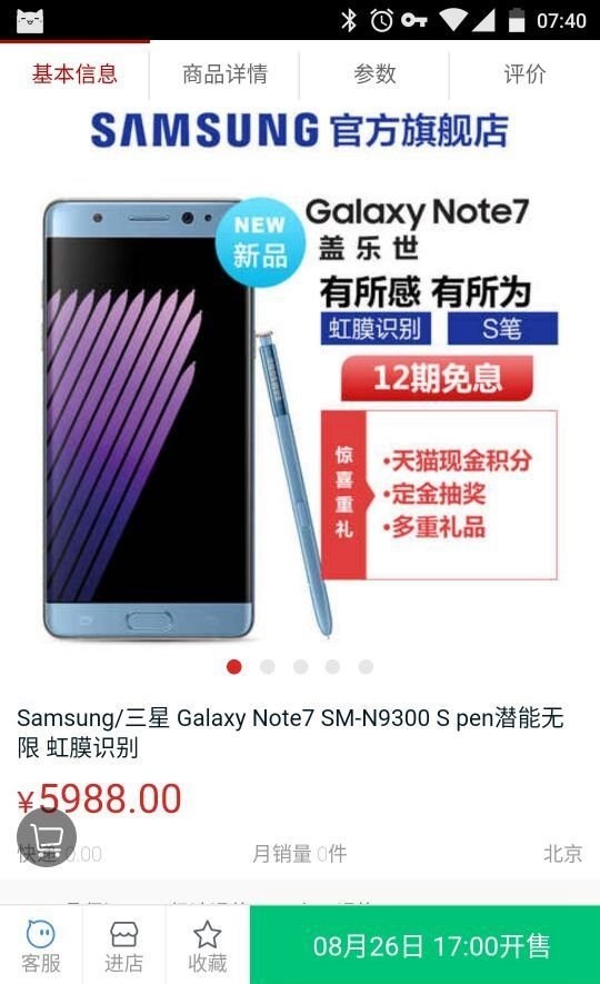 有網友發現,三星天貓旗艦店商品頁面出現了Note 7國行的售價信息,其會在于8月26日下午17:00開售,64GB版本售價為5988元,比之前的預想貴了一些