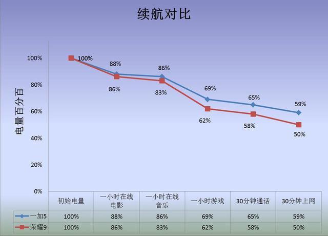 通過 4 個小時的續航測試來看,二者的實際續航表現跟理論續航表現一樣, 在連續 4 個小時后,一加 5 最終剩下的電量,而榮耀 9 剩下的電量。當然,二者的續航表現都可以說是相對不錯,畢竟筆者所設置的模擬項目都屬于相對于耗電的操作。