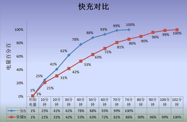 充電方案上,一加5 采用DASH極速閃充技術,其快充的實質方案是“低壓快充”;榮耀 9 采用的華為快充技術,其快充的實質方案是“高壓快充”。而對于這兩種快充原理筆者就不再用過多的介紹,下面,我們就來看看二者在充電效率上的差距: