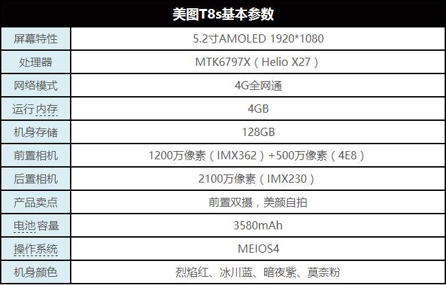 在第一代美圖手機發布之初,因為主打外觀、美顏自拍而不注重硬件性能,美圖手機在當時曾被冠以“花瓶”。而發展到現在,美圖手機的硬件性能已經非常主流,早已經不再是好看不好用的花瓶。美圖T8s搭載聯發科Helio X27十核處理器,配備4GB運行內存,128GB超大容量機身存儲。這對于絕大多數用戶來說都是非常夠用的。
