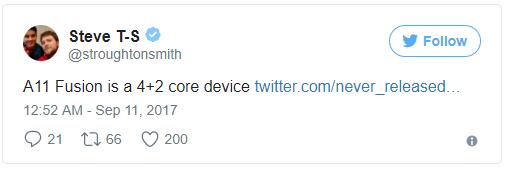 泄露的iOS11 資料揭示了標號為0- 5 的 6 個CPU(中央處理器)。開發者史蒂夫·特勞頓-史密斯(Steve Troughton-Smith)說,其中 4 個是處理能力很高的“Mistral”內核,另外 2 個“Monsoon”內核用來完成對處理能力要求不高的任務。