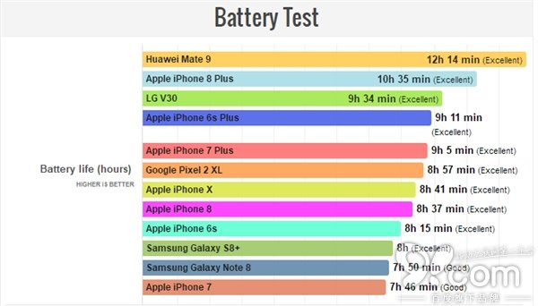 這樣的結(jié)果總的來說還算優(yōu)秀,相比更大電池容量的三星Galaxy S8+/Note 8好得多,同時略高于iPhone 8,但是遠(yuǎn)遠(yuǎn)不如iPhone 8 Plus(超過十個半小時),也比Pixel 2 XL差一些。