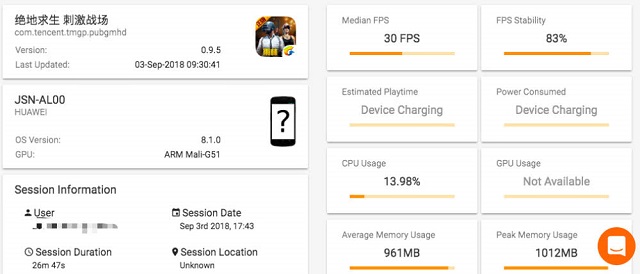再來看下這款手機在絕地求生:刺激戰場中的表現。在畫質設置為HDR高清、幀率設置為高的情況下,榮耀8X的幀率表現相當平穩,平均幀數為30幀,游戲全程基本可以保持流暢。對一款千元機來說,這樣的表現已經比較不錯了。
