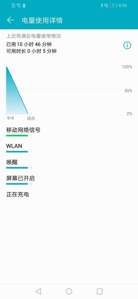 我們的續航測試方法為:屏幕亮度手動一半、音量插耳機狀態下一半、連接WiFi連續播放B站1080P在線視頻。榮耀8X的表現相當搶眼,堅持時間超過了10個半小時(2%電量后系統會自動關機)。