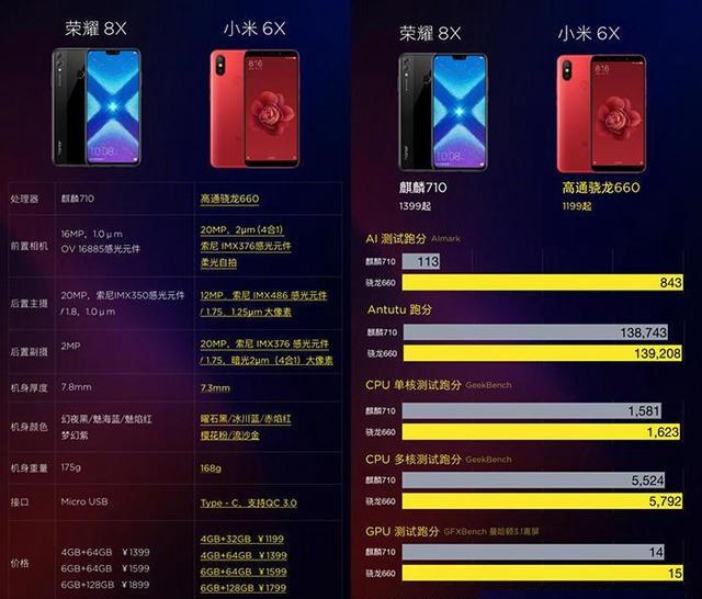 先不下結論,首先來對比看看榮耀8X和小米6X的配置、價格區別,作為兩款售價相近的千元全面屏手機,參數方面的區別如下。