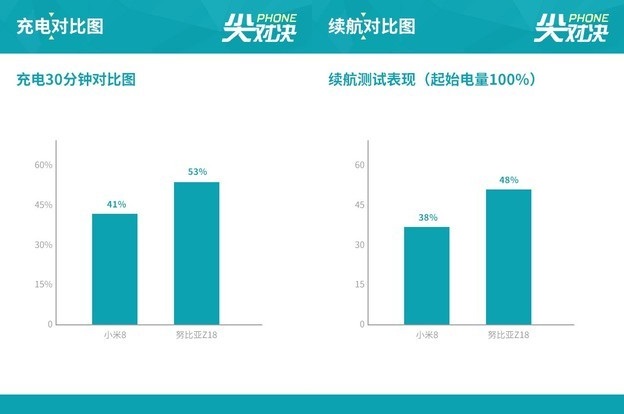 從測試結果來看,努比亞Z18續航與充電表現小幅領先小米8,有一定的續航優勢。不過,小米8支持QC 4.0快充協議,未來可以通過更換充電器體驗更快的充電速度。