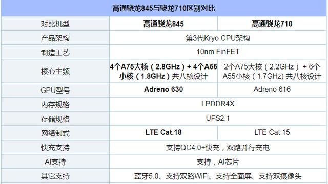 魅族16X搭載的是高通驍龍710處理器,而魅族16則為高通驍龍845,這兩款CPU都是基于10nm先進工藝,功耗都很低,主要是性能上的差異,以下是這兩款CPU規格參數對比。