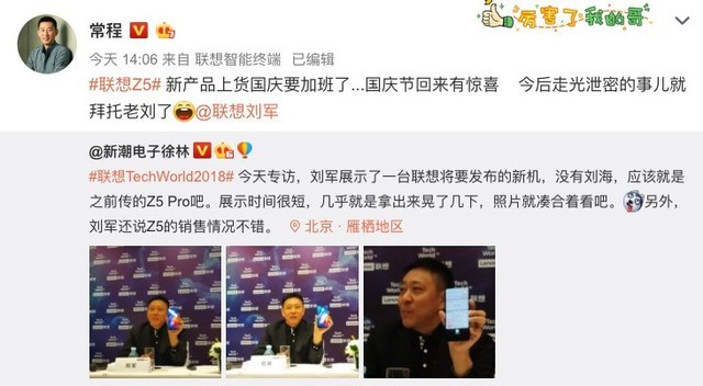 常程在今天下午發(fā)博@劉軍稱,“新產(chǎn)品上貨國慶要加班了...國慶節(jié)回來有驚喜。今后走光泄密的事兒就拜托老劉了。”看來這款滑屏手機(jī)有很大幾率將在十月中旬或月底與大家見面,對(duì)于“聯(lián)想Z5 Pro”你還有哪些期待呢?不妨留言分享。