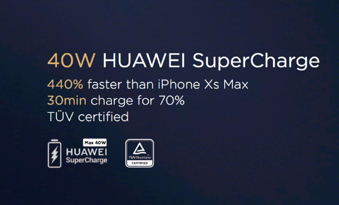 除此之外,Mate20 Pro支持40W超級快充,官方宣稱在30分鐘內可以充電70%,并且獲得德國萊茵安全認證。而且華為Mate20 Pro支持15W無線快充技術,這也是目前業界功率最高的無線充電。有趣的是,Mate20 Pro還能給其它部分手機進行反向無線充電,這簡直太有趣了。