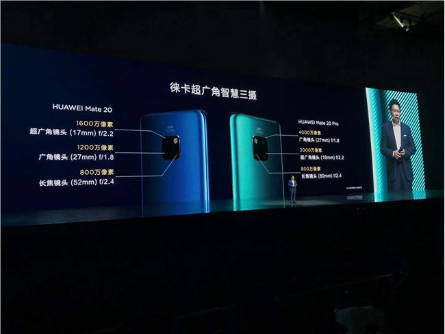 拍照方面,Mate20 Pro 搭載了三顆徠卡認證的 4000 萬像素廣角、2000 萬像素超廣角和 800 萬像素 3 倍光學變焦鏡頭。Mate20 則配備了 1600 萬像素超廣角、1200 萬像素廣角和 800 萬像素 2 倍變焦鏡頭。