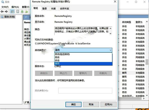 雙擊打開(kāi)Remote Registry設(shè)置后,啟動(dòng)類(lèi)型改成“禁用”,并點(diǎn)擊底部的“確定”保存就可以了。