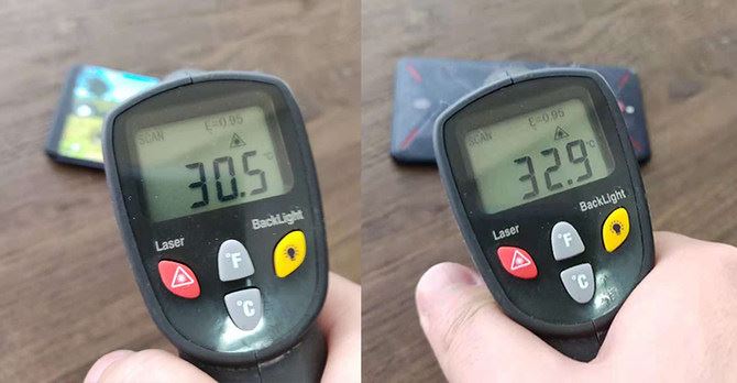 在游戲測試的同時,我們也對其溫度進行了檢測,下面是60分鐘游戲后紅魔Mars電競手機的實際溫度: