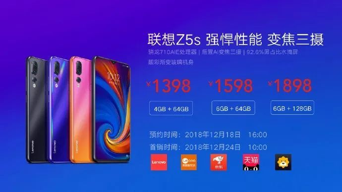 同時發布會上還發布了聯想Z5s,采用6.3英寸2340×1080分辨率微孔水滴屏,搭載驍龍710 AIE處理器,后置三攝:800萬長焦+1600萬主攝+500萬虛化,前置1600萬像素。