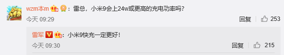 1月15日,有網(wǎng)友在雷軍微博下詢問:“雷總,小米9會(huì)上24W或更高的充電功率嗎?”雷軍回應(yīng)稱:小米9快充一定會(huì)更好!這是雷軍今年首次公開透露關(guān)于小米9的信息。