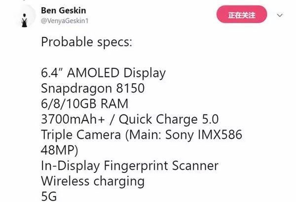 著名爆料人Ben Geskin爆料,小米9將搭載QC 5.0快充,內(nèi)置3700mAh容量電池,提供6/8/10GB運(yùn)行內(nèi)存,擁有5G版本。