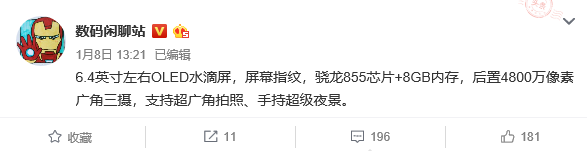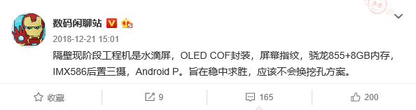 國(guó)內(nèi)爆料者@數(shù)碼閑聊站 補(bǔ)充了部分小米9的信息,他表示小米9將會(huì)采用水滴屏設(shè)計(jì)而非“挖孔屏”,但正因?yàn)槿绱诵∶?才得以加入屏幕指紋功能。