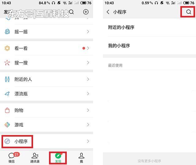 4、在微信上點(diǎn)擊【發(fā)現(xiàn)】,找到【小程序】,我們進(jìn)入到小程序中,在頁(yè)面的右上角有一個(gè)搜索按鈕,點(diǎn)擊它進(jìn)入搜索功能。