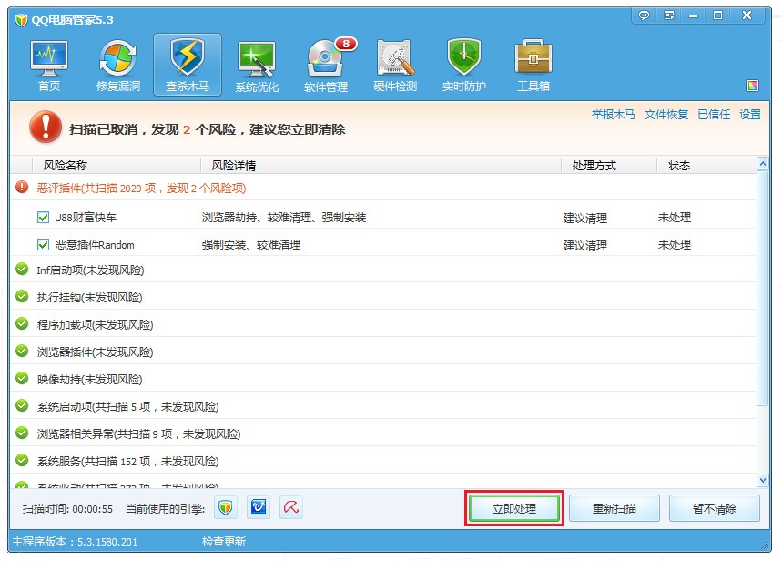 答:當掃描出木馬時,QQ電腦管家已經幫您勾選了所有木馬,您只需要點擊“立即清除”,即可輕松清除所有的木馬。有些木馬需要重啟計算機才能徹底清除,我們建議您立即重啟,以盡快消除木馬對您系統的危害。